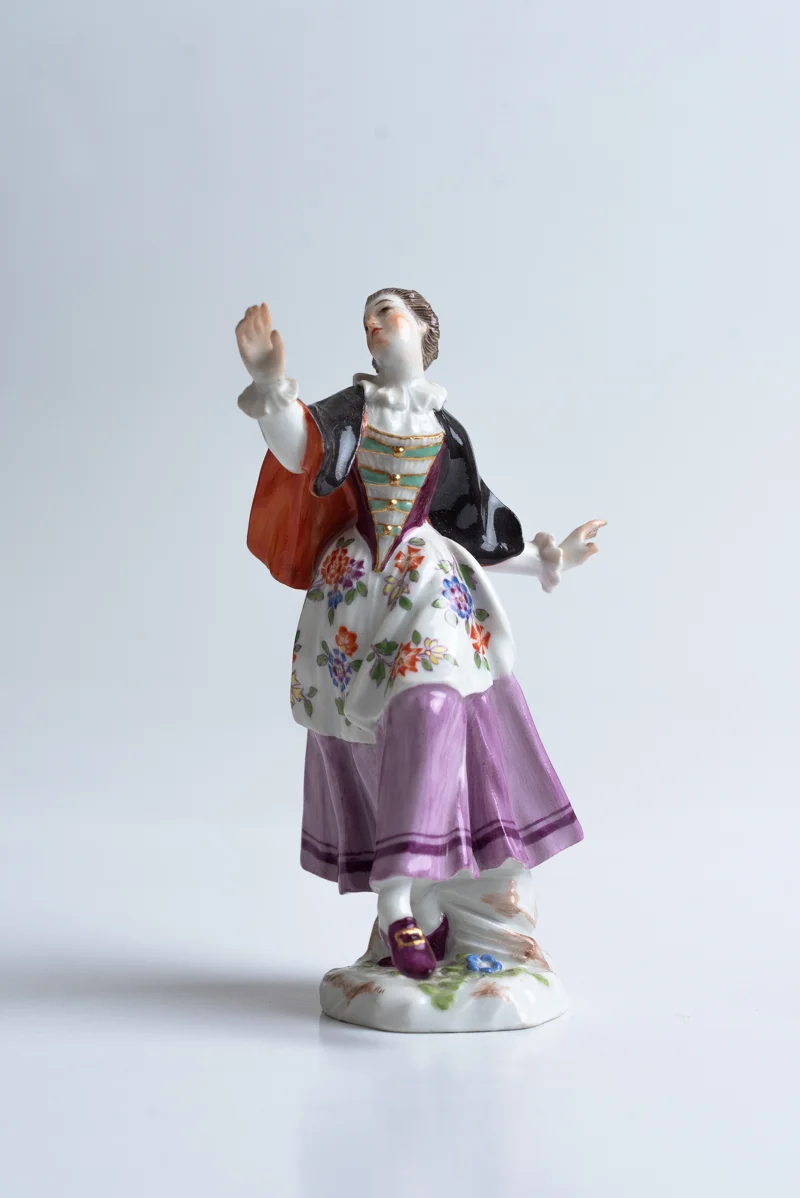 Spinto dal fascino per questo tipo di attori, Johann Joachim Kaendler in particolare ha affrontato tematicamente la Commedia dell'Arte e ha creato per la prima volta le figure in porcellana di Meissen. I suoi gesti e posture teatrali, le espressioni facciali espressive e i costumi colorati con pantaloni attillati corrispondevano soprattutto all'interesse di Kaendler per le figure in movimento. Come era consuetudine all'epoca, utilizzò come modelli incisioni su rame di Jean-Antoine Watteau e Jacques Callot, nonché influenze del classicismo emergente.